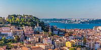 Gezicht op het fort Castelo de Sao Jorge en de wijk Mouraria in de oude stad Lissabon in het voorjaar, Portugal.