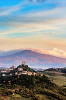 Panoramisch uitzicht op Castiglione d'Orcia in het avondlicht in de Val d'Orcia, Toscane, Italië.