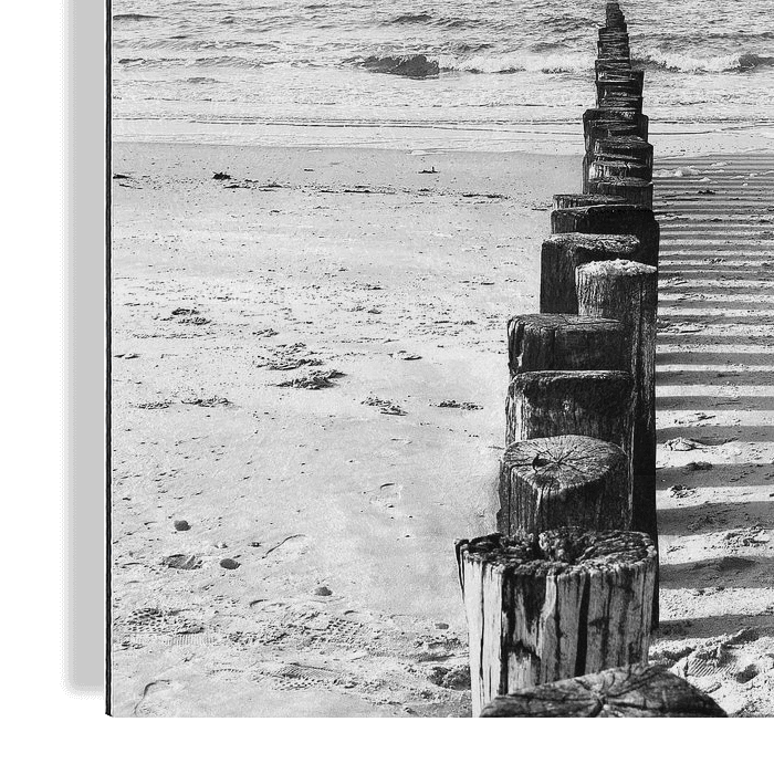Golfbreker paaltjes die schaduwen werpen op het strand van Vlissingen Zeeland, in zwart-wit met op het laatste paaltje in zee een Aalscholver die zijn vleugels droogt in de wind en zon.