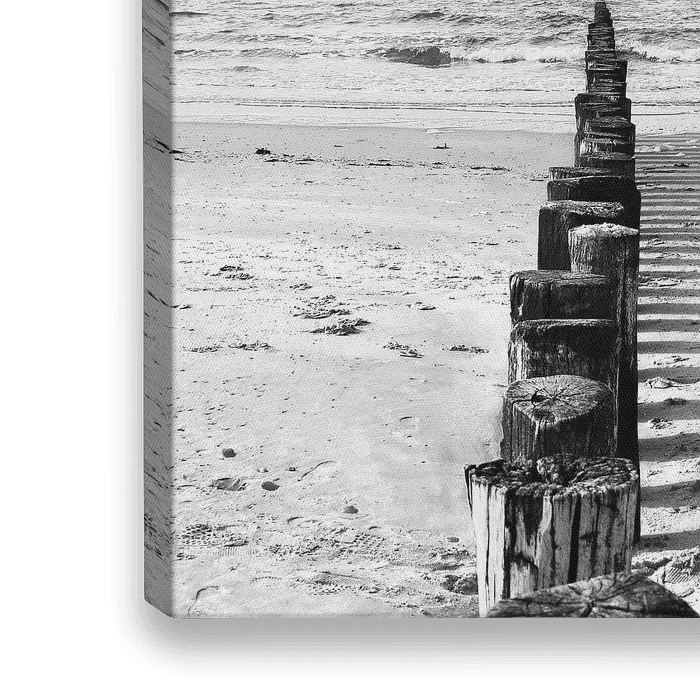 Golfbreker paaltjes die schaduwen werpen op het strand van Vlissingen Zeeland, in zwart-wit met op het laatste paaltje in zee een Aalscholver die zijn vleugels droogt in de wind en zon.