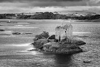 Een zwart-wit foto van Castle Stalker, een middeleeuws torenhuis met vier verdiepingen, schilderachtig gelegen op een getijden eilandje aan Loch Laich, een inham van Loch Linnhe, Schotland.