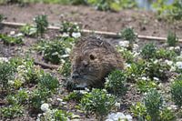 Torgau, Sachsen, Germany 3rd May 2022. LAGA Landesgartenschau Torgau 2022 State garden show. Nature is the gardeners friend… sometimes. In newly planted bed of flowers on the banks of a lake Bob the Beaver (Castor fiber) comes and takes a dinner of a light salad of viola’s and daisies.