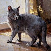 Dit elegante kunstwerk uit de Cat Art Collection legt de verfijnde schoonheid en rustige gratie van de Russische Blauwe kat vast in een luxueuze, museumwaardige schilderstijl. De slanke kat staat zelfverzekerd op een houten vloer, badend in zacht, warm zonlicht dat door een nabijgelegen raam naar binnen stroomt. Zijn gladde grijze…