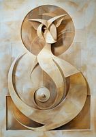 Abstract portret van een kat in naturel tinten met vloeiende vormen, kubistische elementen en een grove textuur.