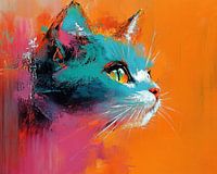 Cat in Tangerine - Op dit schilderij zie je een kleurrijke kat met een opvallend turquoise gezicht en een achtergrond van warme kleuren zoals oranje en roze, wat het stuk een modern en levendig gevoel geeft.
