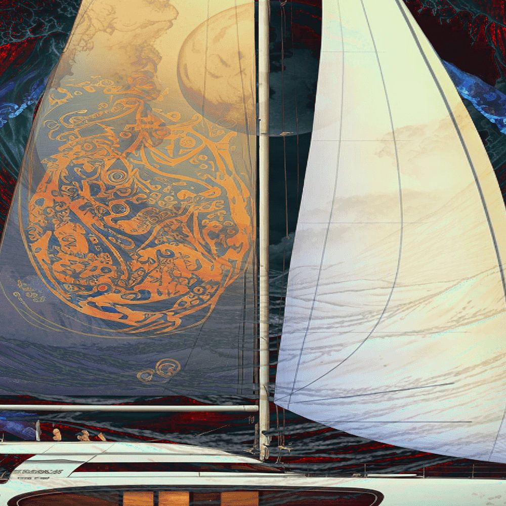 Op de voorgrond ontvouwt zich de gratie van een zeilcatamaran, gestileerd in een elegant zijaanzicht. Het hoofdzeil is doorweven met mystieke patronen die het beeld een speciale uitstraling geven. Onder de catamaran biedt een klein gedeelte een glimp van de fascinerende onderwaterwereld, terwijl een blauwe ring van kolkend water zich achter de boot uitstrekt.