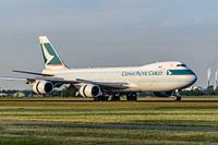 Een Boeing 747-8 vrachtvliegtuig van Cathay Pacific Cargo is geland op de Polderbaan.