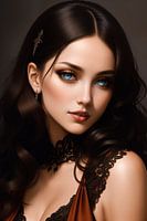 Prachtig gedetailleerd portret van Catherine, een vrouw met bruine haren en lichte blauwe ogen die meteen je aandacht trekken. Ze draagt een rood/bruine zijden jurk met zwart kanten details. In haar haar een metalen speldje. Digitaal gemaakt en verder uitgewerkt door het werk te voorzien van de juiste kleurstelling.