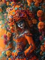 Een Mexicaanse Catrina, gehuld in warme oranjetinten, straalt elegantie en mystiek uit. Haar gezicht is kunstig beschilderd met verfijnde Día de los Muertos-schedelpatronen, terwijl feloranje bloemen haar hoofd sieren. Diepe schaduwen en levendige kleuren versterken haar betoverende blik, terwijl de achtergrond een sfeervolle, zachte…