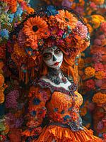 Een Mexicaanse Catrina, gehuld in warme oranjetinten, straalt elegantie en mystiek uit. Haar gezicht is kunstig beschilderd met verfijnde Día de los Muertos-schedelpatronen, terwijl feloranje bloemen haar hoofd sieren. Diepe schaduwen en levendige kleuren versterken haar betoverende blik, terwijl de achtergrond een sfeervolle, zachte…