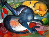 Bewerking van het schilderij Zwei Katzen van Duits expressionistisch schilder Franz Marc. Kleurrijk abstract schilderij met twee katten in voornamelijk blauw en geel tinten op grof canvas doek.