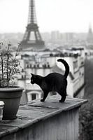 Deze sfeervolle zwart-witfoto toont een zwarte kat die elegant op een Parijs dak staat. Zijn silhouet steekt mysterieus af tegen de heldere lucht, terwijl de Eiffeltoren en de daken en schoorstenen van de stad wazig op de achtergrond te zien zijn. De foto straalt een kalme, poëtische sfeer uit en vangt de charme en romantiek van Parijs.…