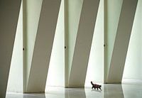 Poes, kat loopt tussen pilaren door in een spel van licht en lijnen.