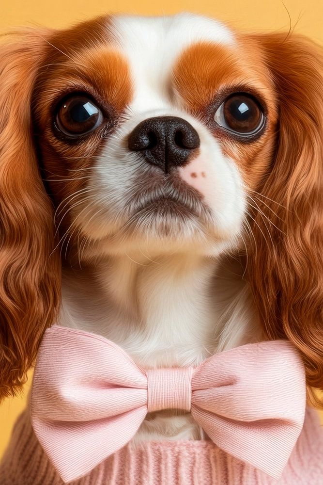 Met heldere, zachte ogen omlijst door pluizige, kastanjebruine vacht, straalt deze Cavalier King Charles Spaniel een vleugje koninklijke elegantie uit. De delicate roze trui en het stijlvolle strikje geven hem een charmante gratie, terwijl de felgele achtergrond zijn betoverende aanwezigheid perfect benadrukt. Een hartverwarmend gezicht!