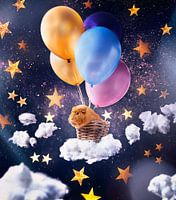 Een oranje cavia in een luchtballon, vliegend door een nachtlandschap van sterren en wolkjes.