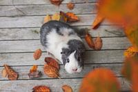 Een cavia op een houten ondergrond met blaadjes om haar heen