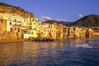 De laagstaande zon schijnt op de oude stadshuizen van Cefalù op Sicilië.