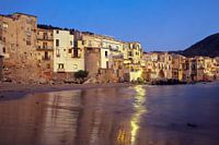 De kust met de oude stadshuizen van Cefalù op Sicilië tijdens het blauwe uur.