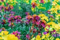 De foto toont een dichte, kleurrijke bloei van de variëteit Erysimum 'Constant Cheer', ook bekend als celandine. De bloemen verschijnen in heldere tinten geel, oranje en paars en staan dicht op elkaar, waardoor een levendig, bijna schilderachtig totaalbeeld ontstaat. De achtergrond is zacht getekend en verwijst alleen naar andere planten en groene gebieden - de focus ligt duidelijk op het intense kleureffect op de voorgrond.