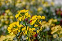 De foto toont een close-up van bloeiende gouden vernisplanten (Erysimum), waarvan de heldergele bloemen in dichte trossen op stevige groene stengels staan. De achtergrond is onscherp, waardoor de intense kleuren van de bloemen op de voorgrond goed uitkomen. De compositie concentreert zich op de natuurlijke structuur en kleur van de plant, zonder afleidende elementen.