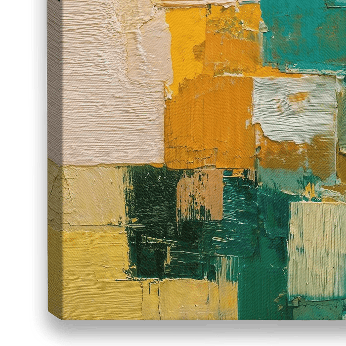 Een abstract schilderij met een mozaïek van rechthoekige blokken en vormen. De penseelstreken zijn zichtbaar en impasto, wat een gevoel van diepte en dimensionaliteit creëert. De compositie oogt dynamisch en enigszins chaotisch, met de blokken die elkaar overlappen en kruisen in een asymmetrische opstelling. Het licht lijkt van…