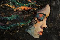 Celestial Silence - Dit vrouwenportret schilderij toont het indrukwekkende zijprofiel van een jonge vrouw wiens gezicht en haren een levendige samensmelting van kleuren en kosmische patronen bevatten. Haar huid toont zachte aardetinten vermengd met lichte turkooizen nuances. De haren van de vrouw zijn niet alleen rijk aan zwarte tinten,…