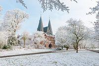 Cellebroederspoort in Kampen in Overijssel, Nederland tijdens een mooie winterdag met sneeuw op de bomen en planten. De Cellebroederspoort is een van de oude stadspoorten van de Hanzestad Kampen.