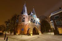 Cellebroederspoort tijdens een koude winternacht in Kampen in Overijssel, Nederland in de oude Hanzestad aan de oever van de IJssel.