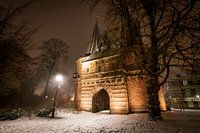 Cellebroederspoort tijdens een koude winternacht in Kampen in Overijssel, Nederland in de oude Hanzestad aan de oever van de IJssel.