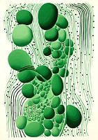 Het kunstwerk is een fascinerende compositie van overlappende cirkelvormen en golvende lijnen in een spectrum van groene tinten.