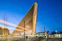 Avondopname van het Centraal Station Rotterdam. Lichtstrepen van tram door tijdopname. Sterk perspectief. Architectuurfoto in kleur.