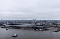 Amsterdam Centraal, het grootste treinstation van Amsterdam. Aan het IJ met de blauw/witte veerponten van het GVB