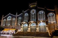 Verlichte gevel Mercado Central in Valencia Spanje bij nacht