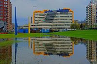 Centrale Bibliotheek Rotterdam, weerspiegeld in een plas.