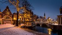 De Bloemenschuit en de Gewelfde Stenen Brug zijn kenmerkend voor een oud stukje Alkmaars centrum. Op de achtergrond kijk je naar de Mient met het Waaggebouw en Waagtoren op de achtergrond. Het heeft gesneeuwd, de straat is sfeervol bedekt met een laagje sneeuw. De winterse verlichting in de bomen is de finishing touch.