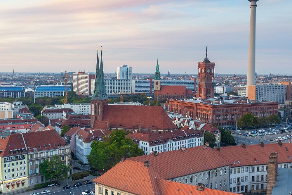 Uitzicht op het centrum van Berlijn met de wijk Nikolai, de tv-toren en het rode stadhuis.