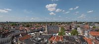 Panoramafoto van het centrum van Gouda met in het midden het oude gotische stadhuis van Gouda op de Markt. Om het stadhuis staan de kramen van de wekelijkse warenmarkt op zaterdag. Foto is gemaakt vanaf het dak van de Sint Janskerk tijdens het evenement 'Beleef Gouda op grote hoogte'.
