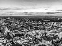 Zwart-witfoto Uitzicht vanaf het City-Hochhaus over het centrum van Leipzig met de Thomaskirche, het oude stadhuis en de markt in de schemering, Saksen, Duitsland