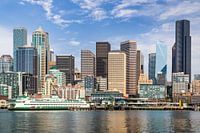 Impressie van de waterkant in Seattle met wolkenkrabbers in het centrum.