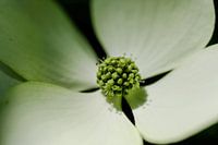 Centrum van een mooie witte bloesem in lichtgroene en witte kleuren, close-up