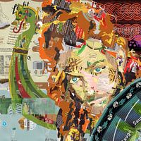 Kleurrijk patchwork samengesteld uit snippers verpakkingsmateriaal. Met gebruikmaking van bedrukkingen van levensmiddelen doosjes is een compositie gemaakt snippers met deels leesbare en herkenbare reklameteksten. Rond een portet zijn afbeeldingen toegevoegd van traditionele viking motieven. Het patchwork is deels fysiek, onstaan met…