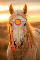 Een majestueus paard schittert in de avondschemering, zijn mannelijke manen omlijsten zijn opvallende gezicht. Felle kleuren sieren zijn voorhoofd en geven het een mystiek karakter. De zachte roodtinten en het stralende geel creëren een harmonieuze band met de natuur, terwijl de warme zonnestralen een bijna magische sfeer creëren.