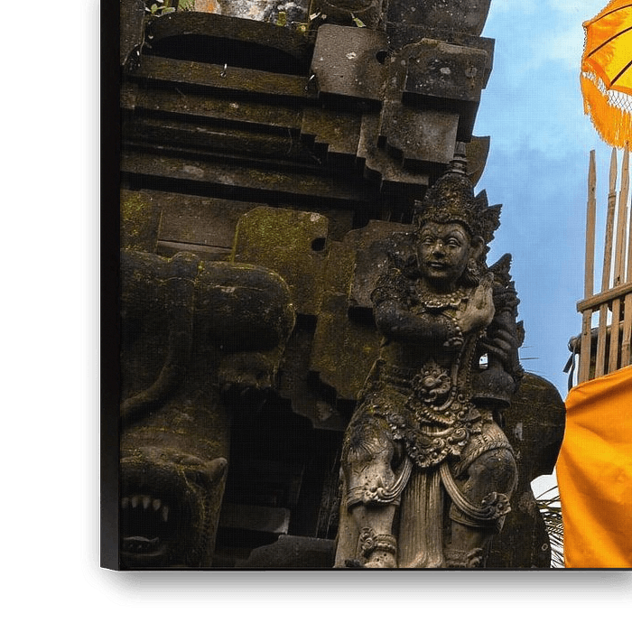 De combinatie van oude stenen structuren, sierlijke houten en bamboe constructies en de levendige kleuraccenten geven deze foto een unieke diepte. Perfect voor liefhebbers van exotische culturen, reizigers naar Bali of iedereen die een stukje mystiek uit het Verre Oosten in huis wil halen.