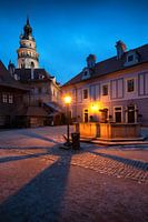 In de vroege avond op het plein van het kasteel in Cesky Krumlov, in Zuid Tsjechië.