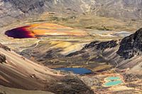 Uitzicht op enkele gekleurde meren vanaf de top van Chacaltaya, een berg van 5.395 meter hoog buiten La Paz, Bolivia.