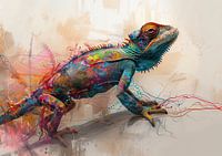 Chameleon Aura - Dit kameleon schilderij toont een buitengewoon levendige en kleurrijke weergave van een kameleon op de voorgrond. De kunstenaar heeft een impressionistische techniek toegepast met moderne digitale elementen, waardoor dit schilderij een fusie is van traditionele en hedendaagse kunst. De kameleon zelf is rijkelijk gedecoreerd met diverse kleuren zoals blauw, rood, groen, geel en oranje, die in elkaar overlopen en een haast psychedelisch effect geven. De achtergrond is abstract met lichte, wazige architecturale vormen en een assortiment van aardtinten en grijzen versmolten met sporadische uitbarstingen van kleur door druppels en lijnen die van de kameleon af lijken te stralen. Deze details suggereren een dynamische interactie tussen het dier en zijn omgeving, waardoor de kameleon lijkt te versmelten met en emergeert uit zijn achtergrond.