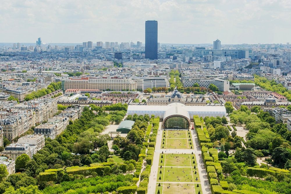 Champ-de-Mars . Een mooi park in Parijs aan jouw voeten. Links het graf van Napoleon: Dome des Invalides . Stuk Franse geschiedenis en in de verte het hedendaagse Montparnasse.