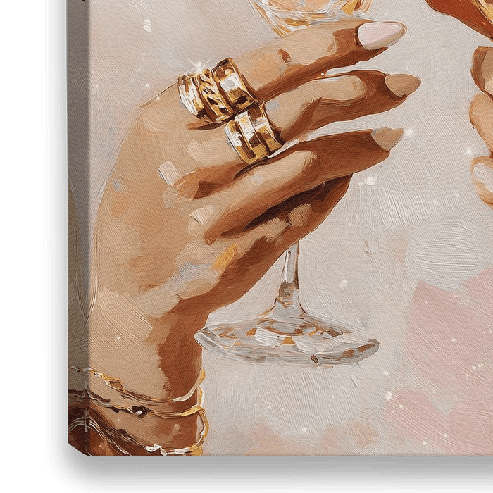 Een glamoureus schilderij van twee elegante handen die klinken met champagneglazen. Perfecte kunst voor wie luxe, viering en feestelijke momenten in huis wil brengen.