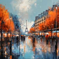 Moderne abstracte muurschildering van de Champs Élysées in Parijs met uitzicht op de Eiffeltoren die eruitziet als een schilderij.