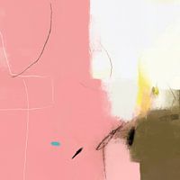 A feminine and vibrant composition. The expansive pink background clashes playfully with olive green tones, while splashes of yellow mimic garden sunlight. Spontaneous linework evokes the casual elegance of a French garden, radiating sophisticated urban charm.